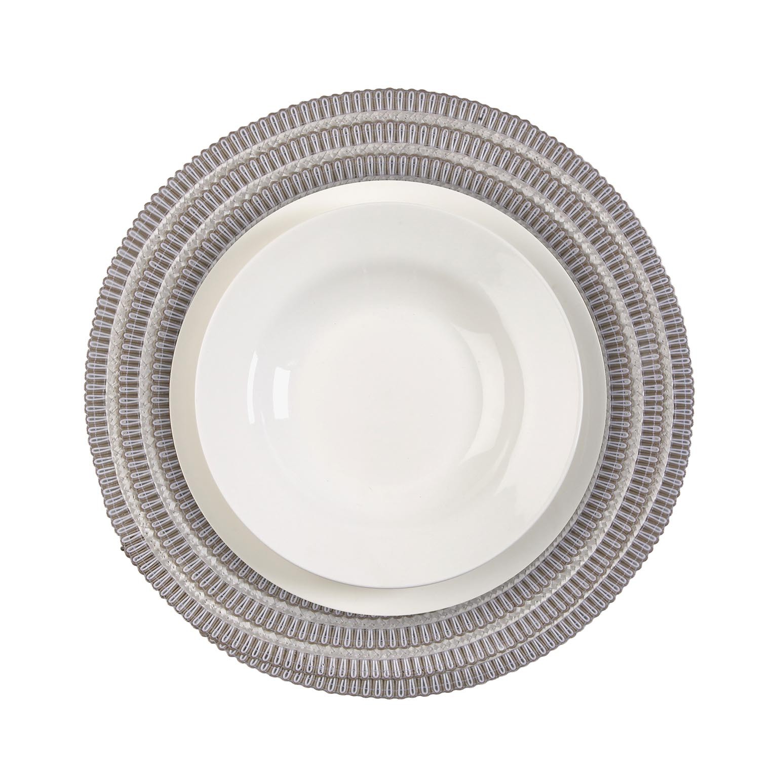 El salvamantel redondo beige y blanco es un complemento funcional y decorativo para la mesa.