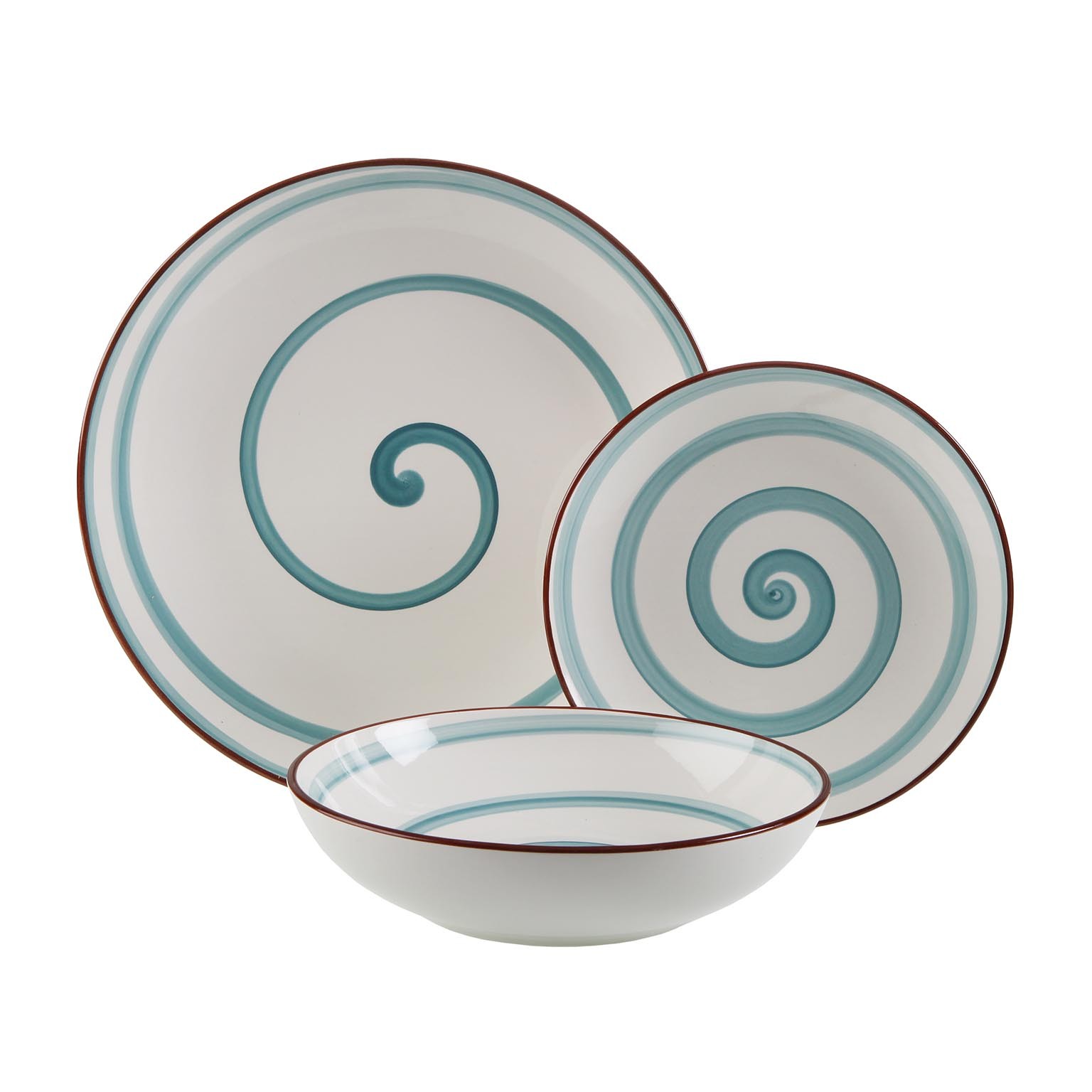Fabricada en dolomita, incluye 6 platos llanos de 26,5 cm, 6 platos hondos de 20 cm y 6 platos de postre de 19 cm.