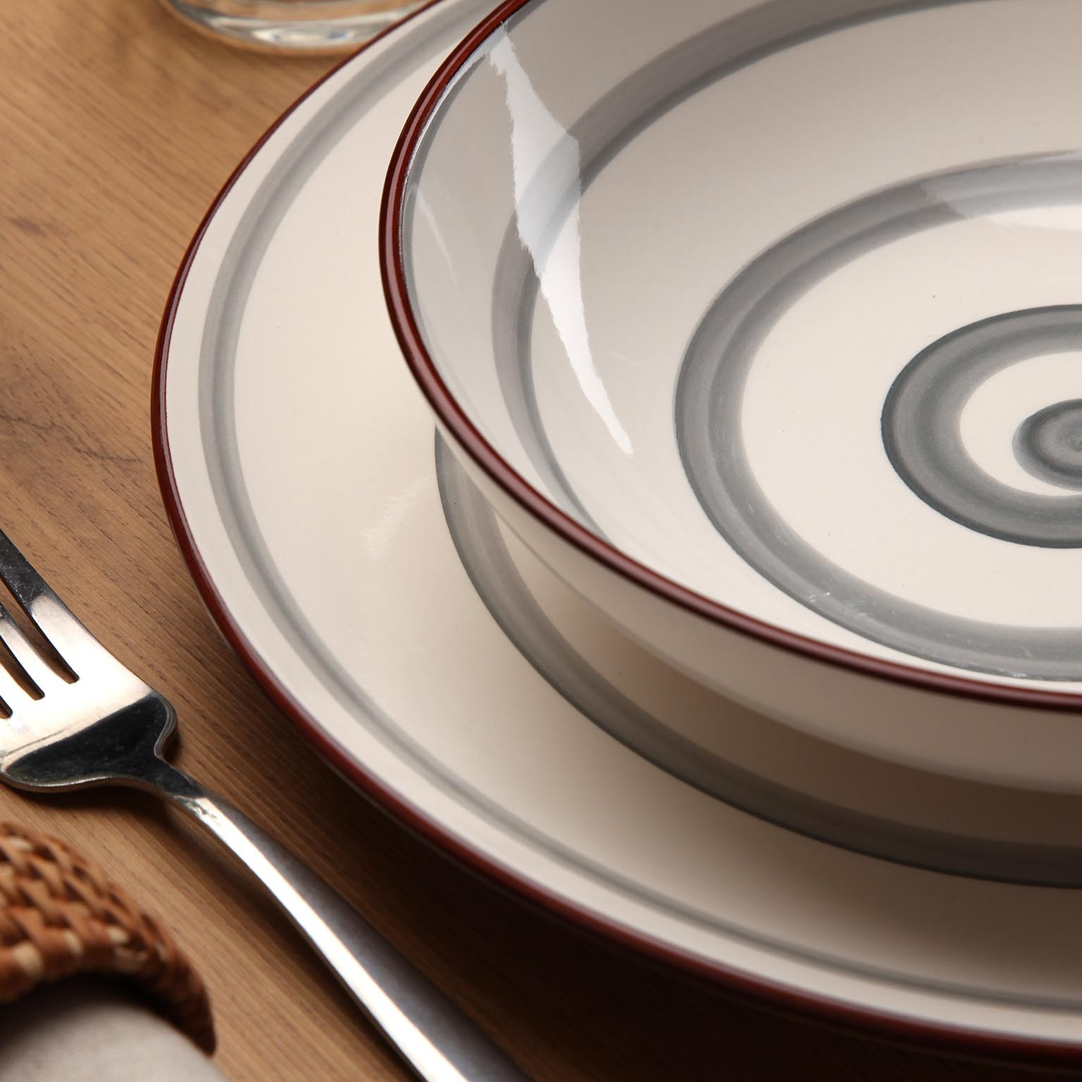 Incluye 6 platos llanos de 26,5 cm, 6 platos hondos de 20 cm y 6 platos de postre de 19 cm, todos con un diseño moderno y minimalista que presenta un elegante patrón en espiral.
