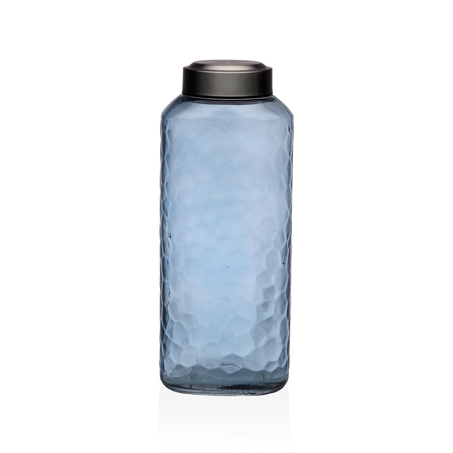 Fabricada en cristal transparente y azul, con tapa de acero, es ideal para almacenar y servir agua, jugos y otras bebidas, siendo perfecta para la mesa del comedor o la nevera.