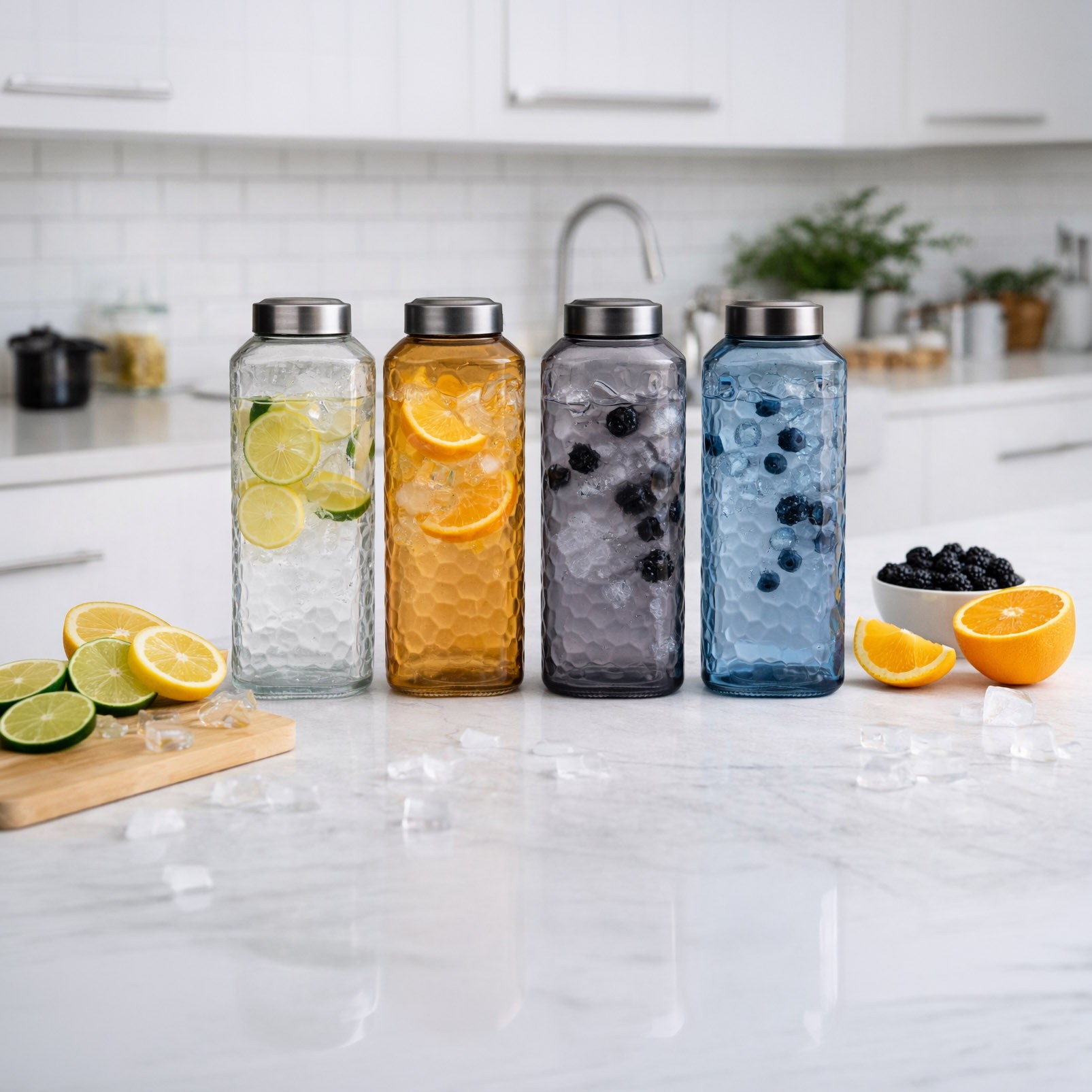 Fabricada en cristal con tapa de acero, esta botella es versátil para eventos y picnics, aportando un toque decorativo a los espacios del hogar.