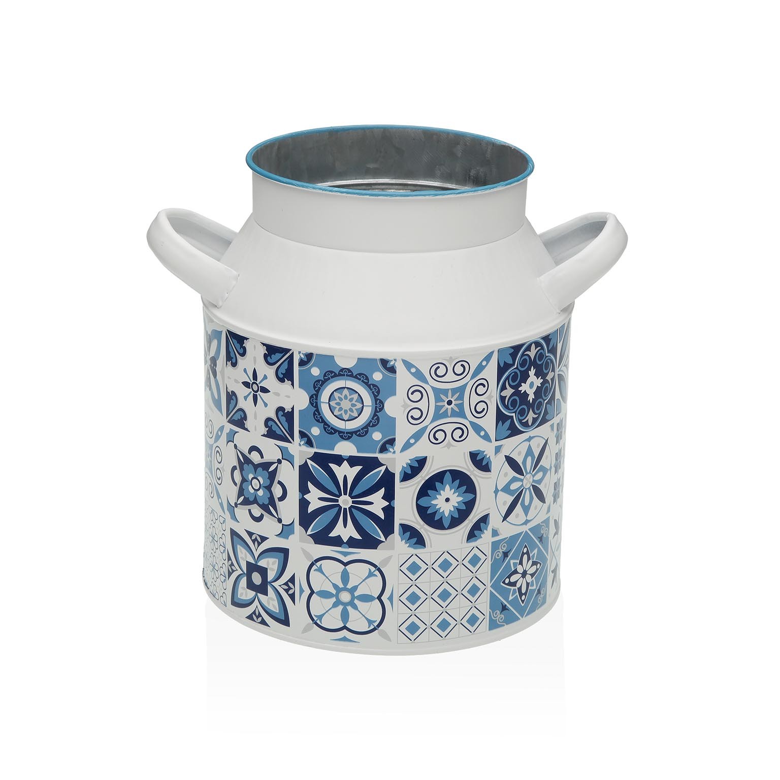Con unas dimensiones de 19,5 cm de altura, 16 cm de ancho y 19,5 cm de largo, este florero de metal presenta un acabado en azul y blanco, adornado con patrones que evocan la tradición.