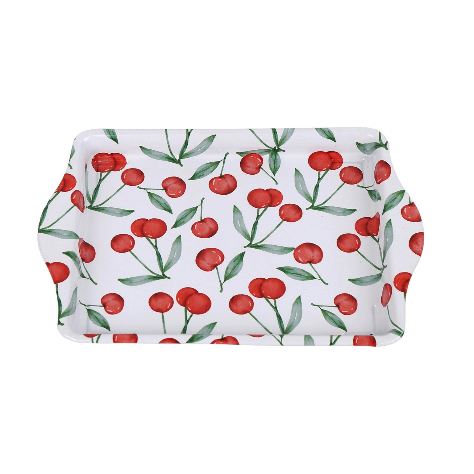 Fabricada en metal y estaño, presenta un diseño moderno con un fondo blanco adornado con vibrantes cerezas rojas y hojas verdes.