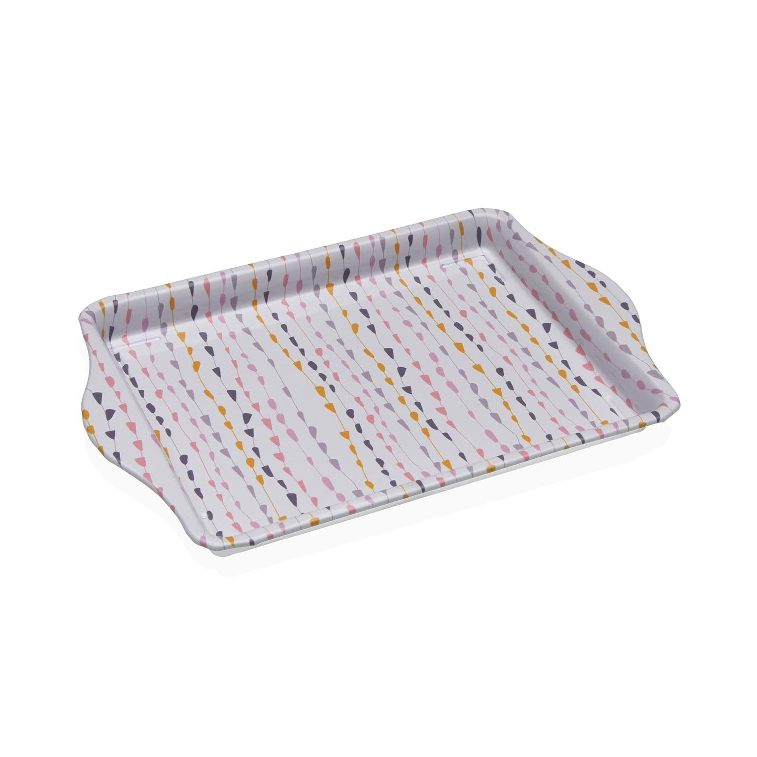 Fabricada en metal y estaño, presenta un diseño moderno en tonos blanco, amarillo, gris y rosa, ideal para servir aperitivos o organizar utensilios de cocina.
