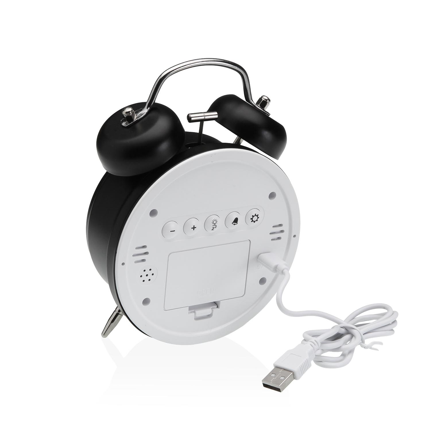 Fabricado en plástico con detalles metálicos en las campanas y soporte, su diseño minimalista se adapta perfectamente a dormitorios, mesas de noche y escritorios.