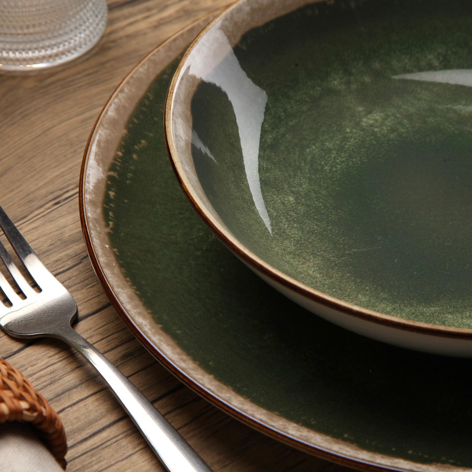 Con un diseño moderno y toques rústicos, incluye 6 platos llanos de 26,5 cm, 6 platos hondos de 20 cm y 6 platos de postre de 19 cm, todos en un atractivo verde profundo con matices.