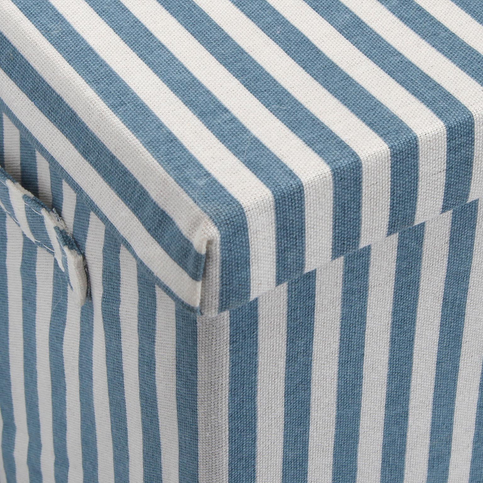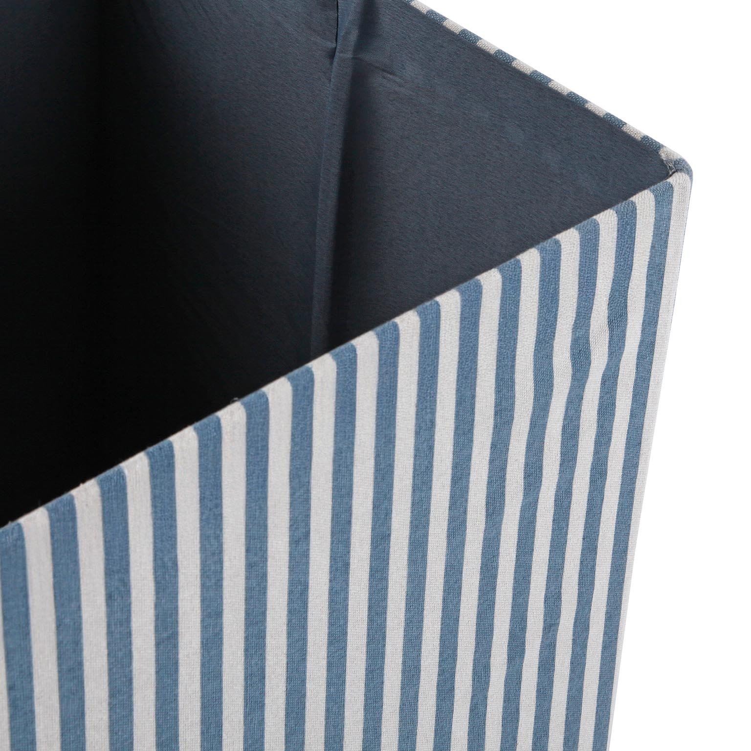 La cesta con tapa rectangular en rayas azul es un complemento funcional y decorativo para el hogar.