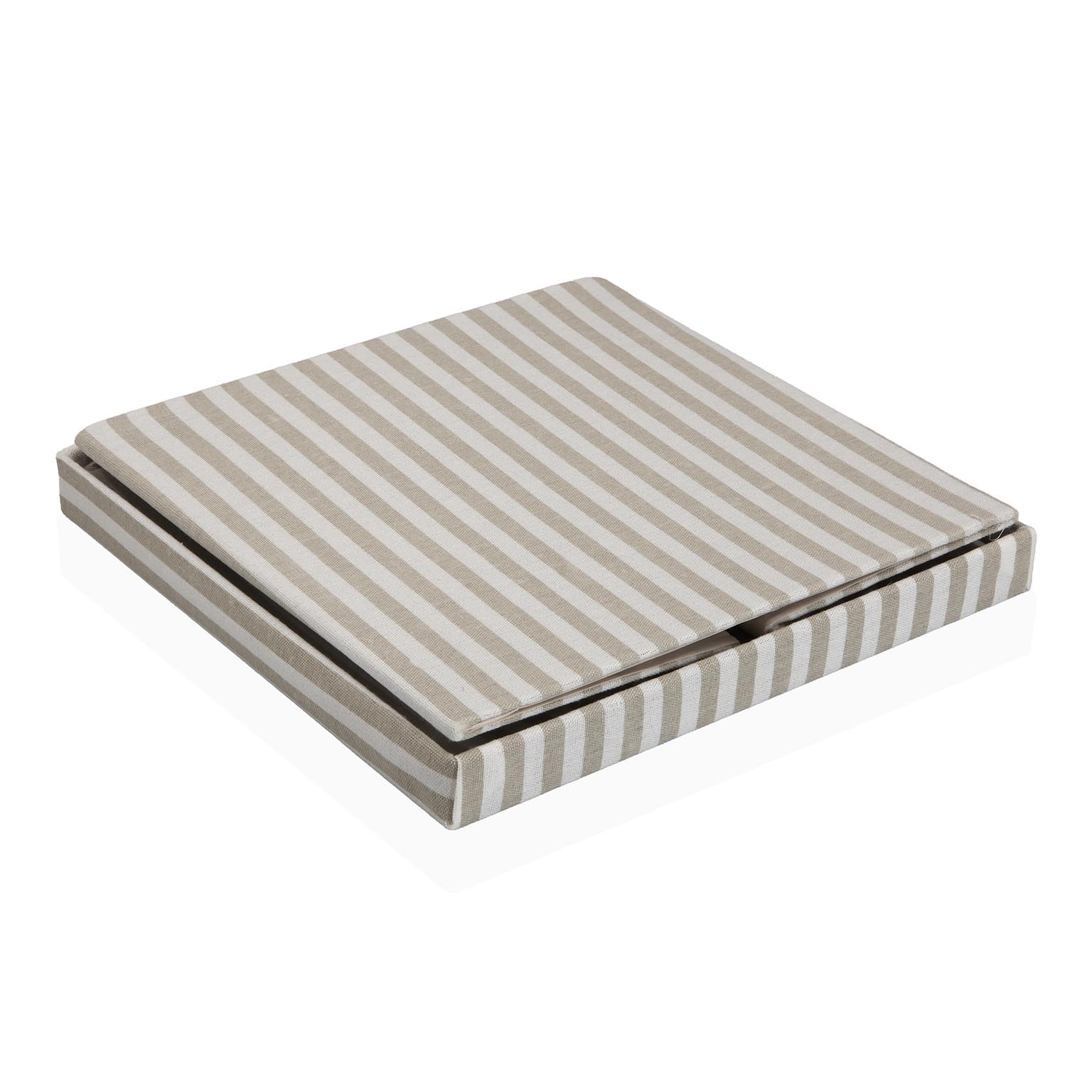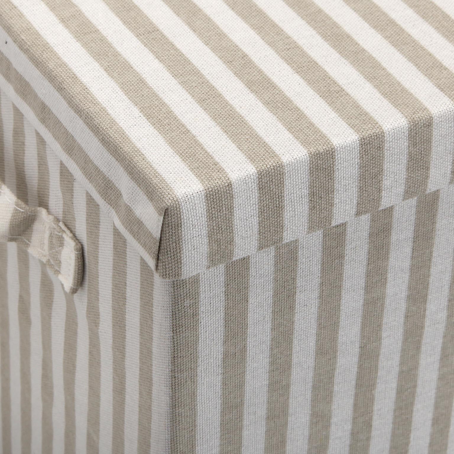 La cesta con tapa cuadrada en rayas gris es un elemento funcional y moderno para el baño.
