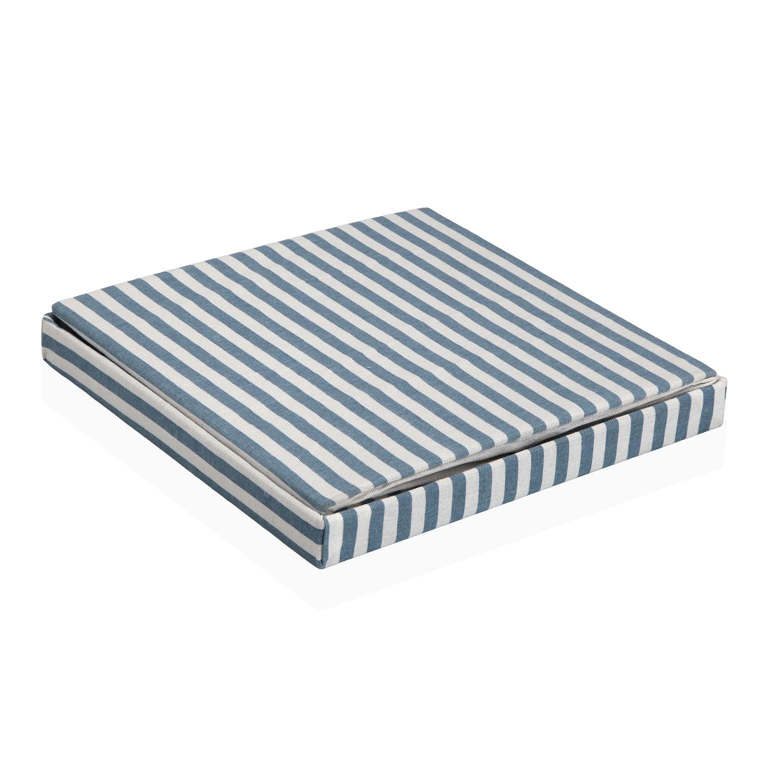 La cesta con tapa cuadrada en rayas azul es un complemento funcional y decorativo para el baño y otros espacios del hogar.