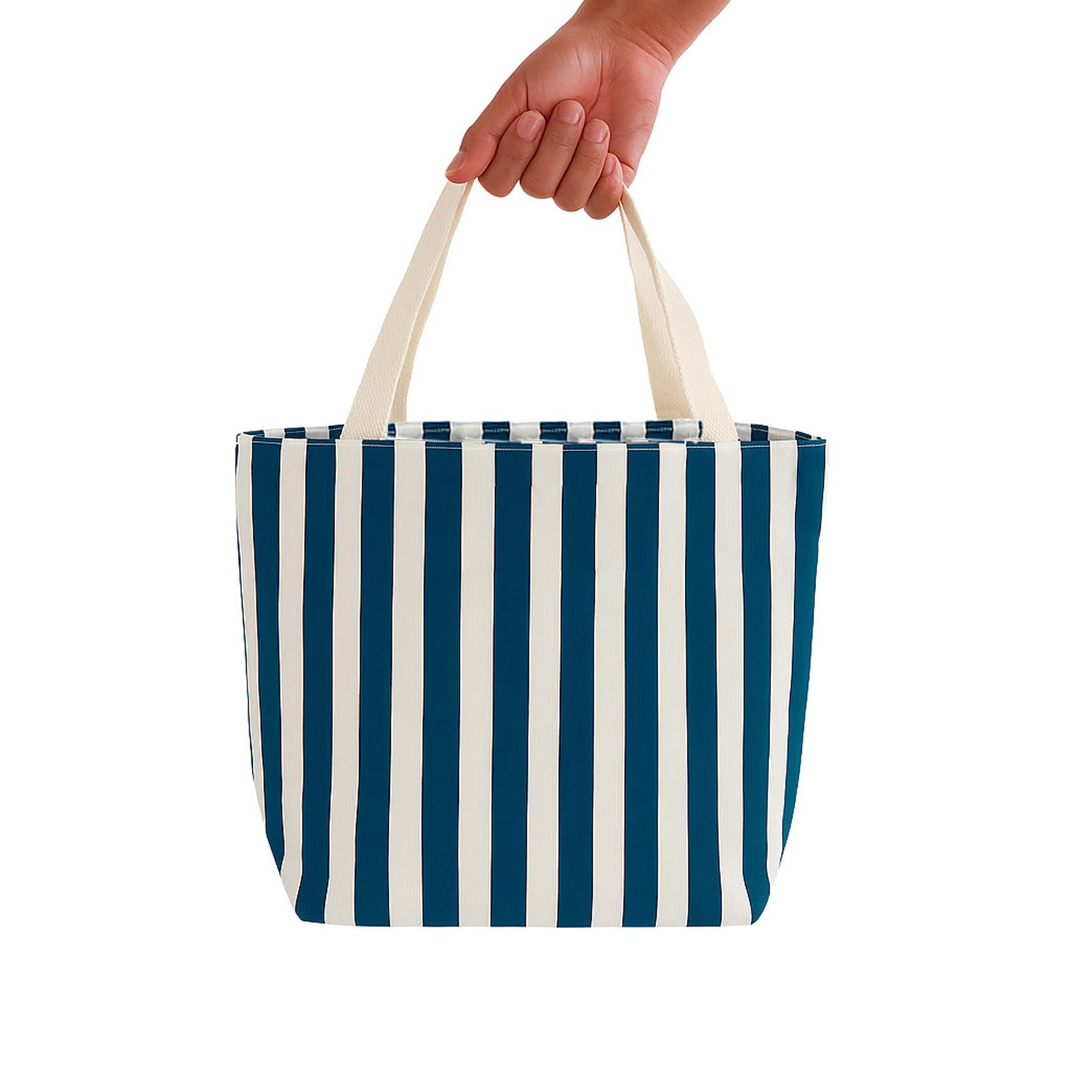Su diseño de rayas en azul marino y blanco se integra fácilmente en cualquier espacio del hogar, desde el baño hasta la lavandería, y su versatilidad permite su uso en diversas situaciones, como en la playa o como bolsa de compras.