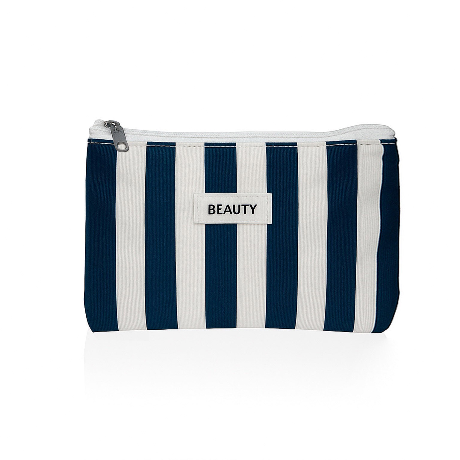 Fabricado en algodón y poliéster, presenta unas dimensiones de 12 cm de altura y 17 cm de ancho, ideal para almacenar productos de higiene personal y cosméticos.