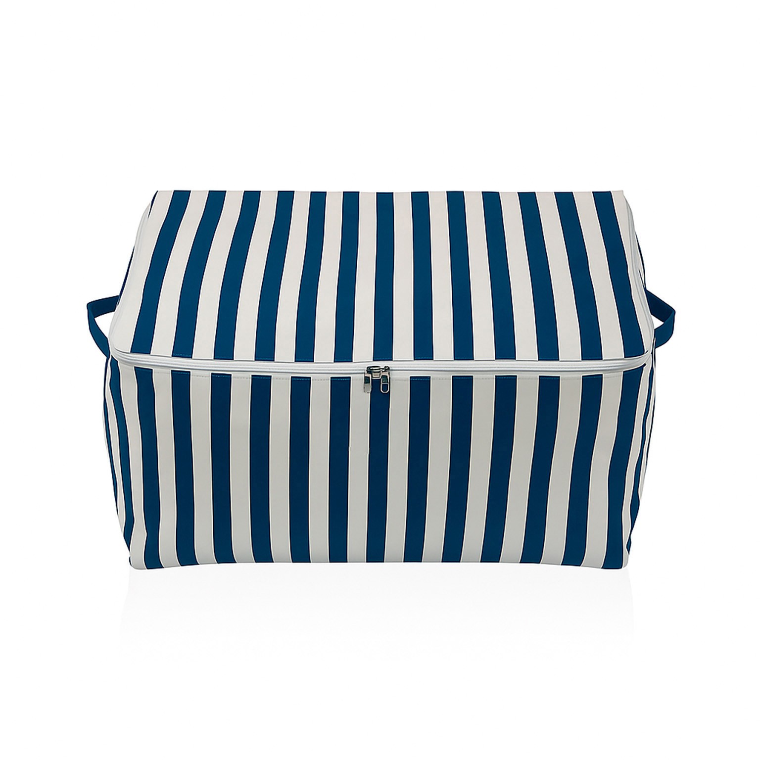 Su diseño moderno con rayas blancas aporta un toque náutico, ideal para almacenar toallas, cosméticos y accesorios.