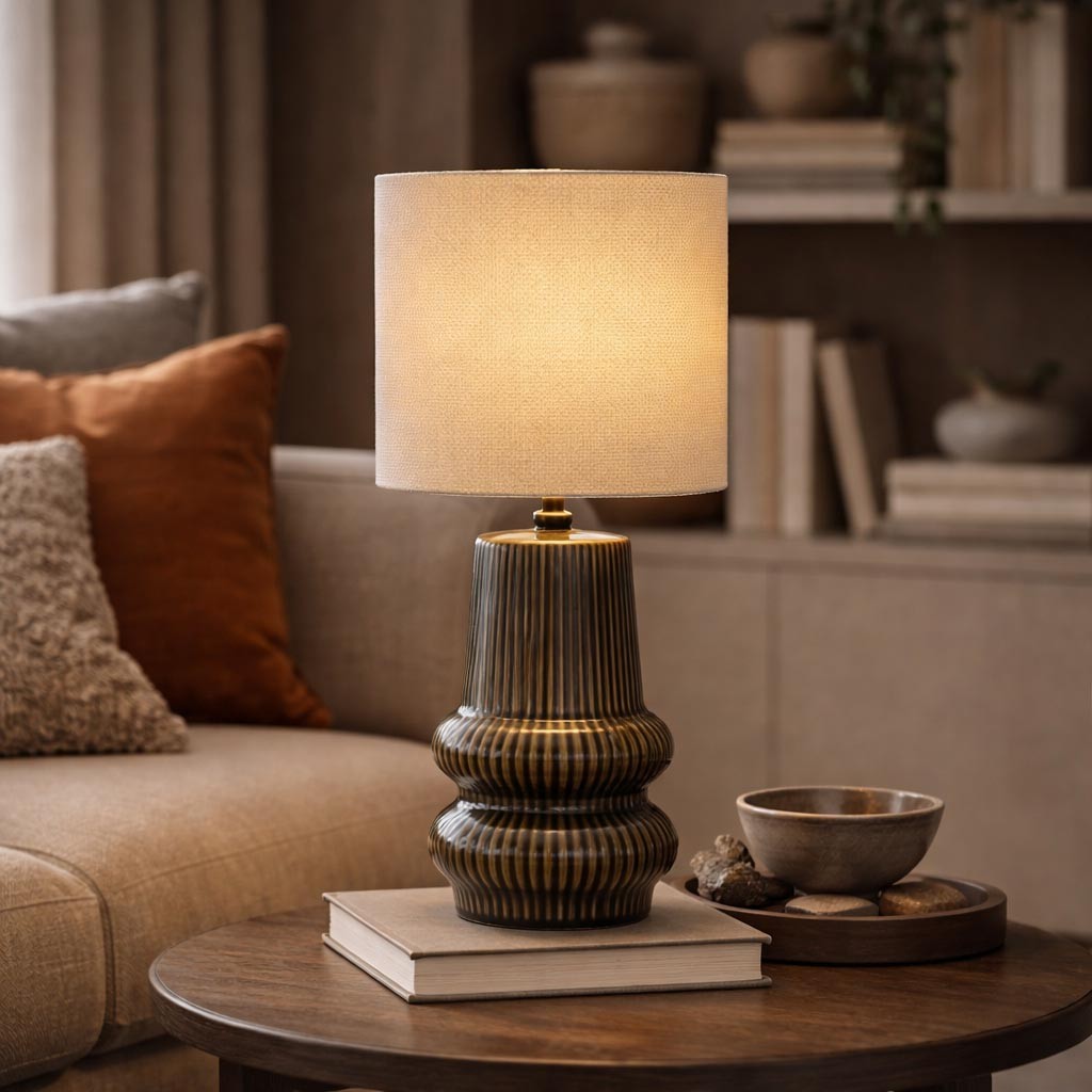Con una base de cerámica en un atractivo tono verde y una pantalla de lino beige, su diseño moderno y suave se adapta a diversos estilos decorativos.