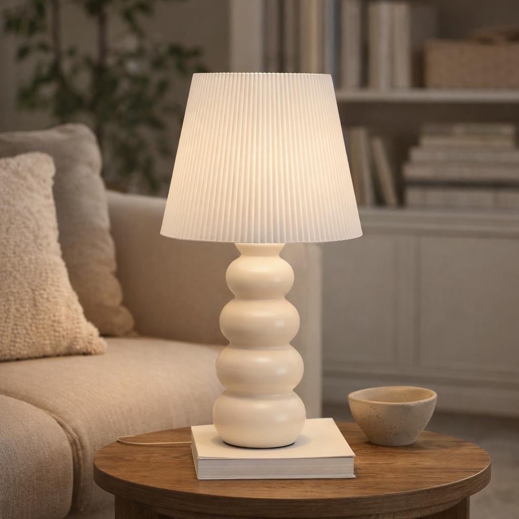 Con una base de cerámica en tonos crema y una pantalla de tela plisada en blanco, su diseño limpio y formas suaves aportan un toque contemporáneo a cualquier espacio.