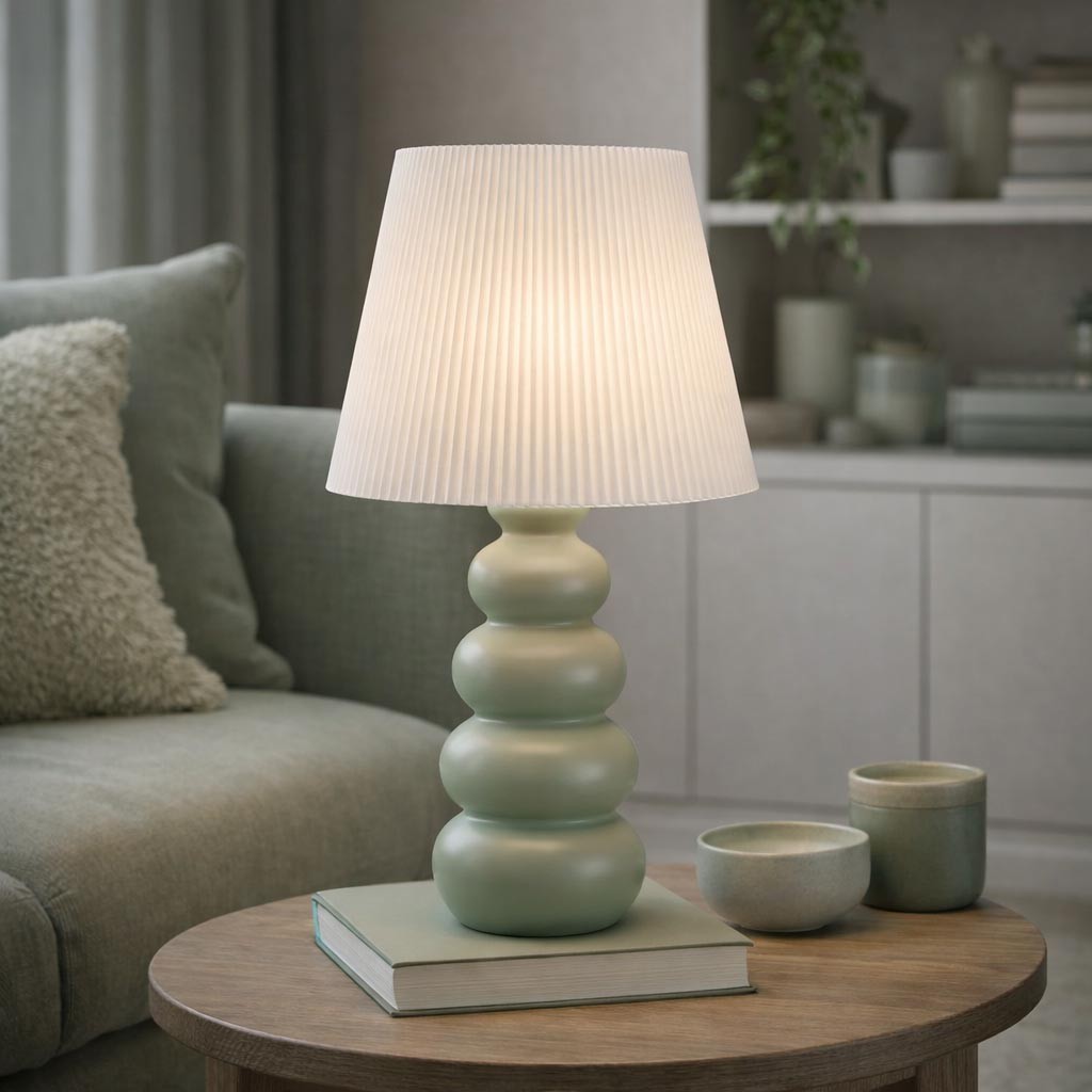 La lámpara Enya gris claro es una elegante lámpara de mesa que combina una base de cerámica con una pantalla de tela de textura plisada.