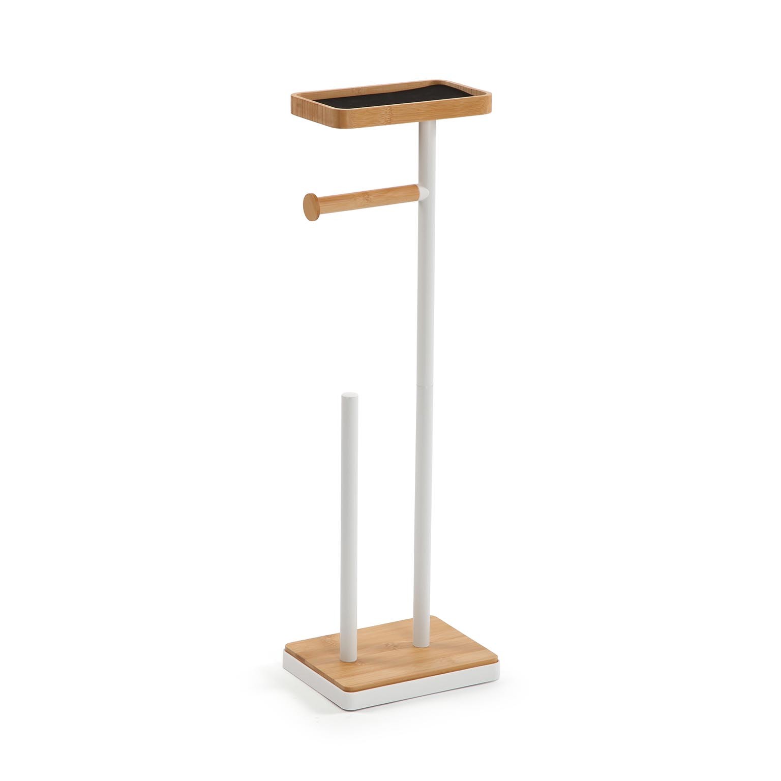 El portarrollos blanco es un accesorio funcional y estético para el baño, diseñado con una estructura metálica pintada en blanco y detalles en bambú.