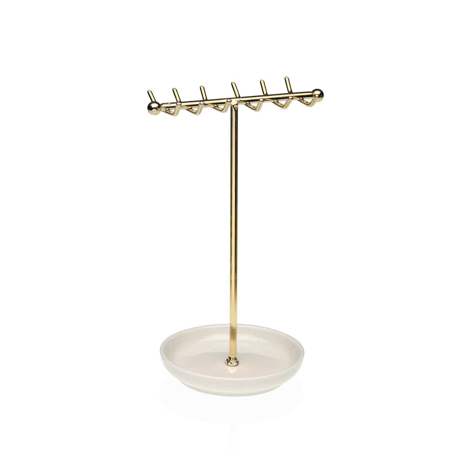 Fabricado en cerámica blanca y con una elegante estructura de hierro dorado, este joyero combina un estilo minimalista con un toque contemporáneo.