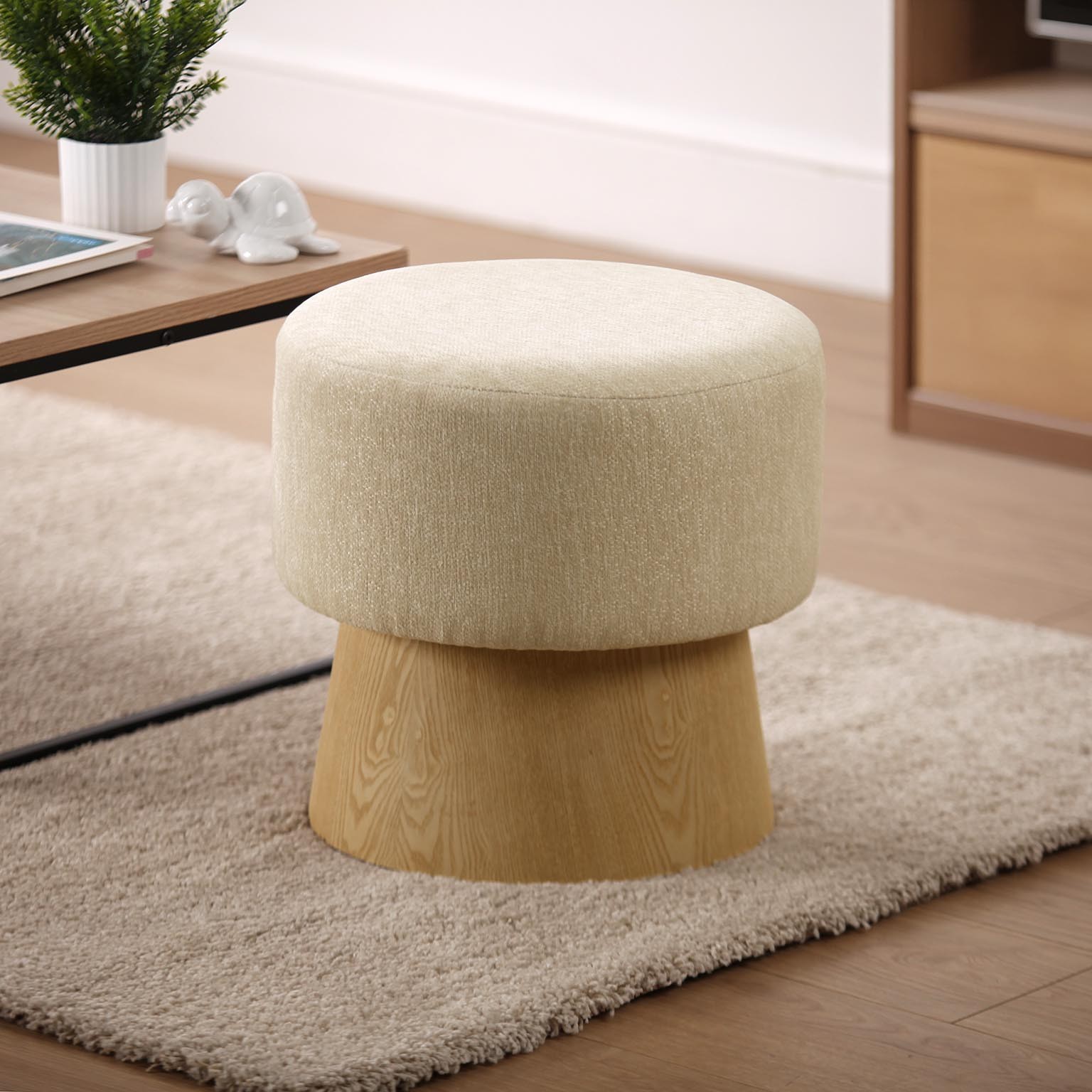 Su diseño compacto permite utilizarlo como asiento adicional o mesa auxiliar, complementando decoraciones contemporáneas y eclécticas con su elegante tonalidad beige y acabados en madera clara.