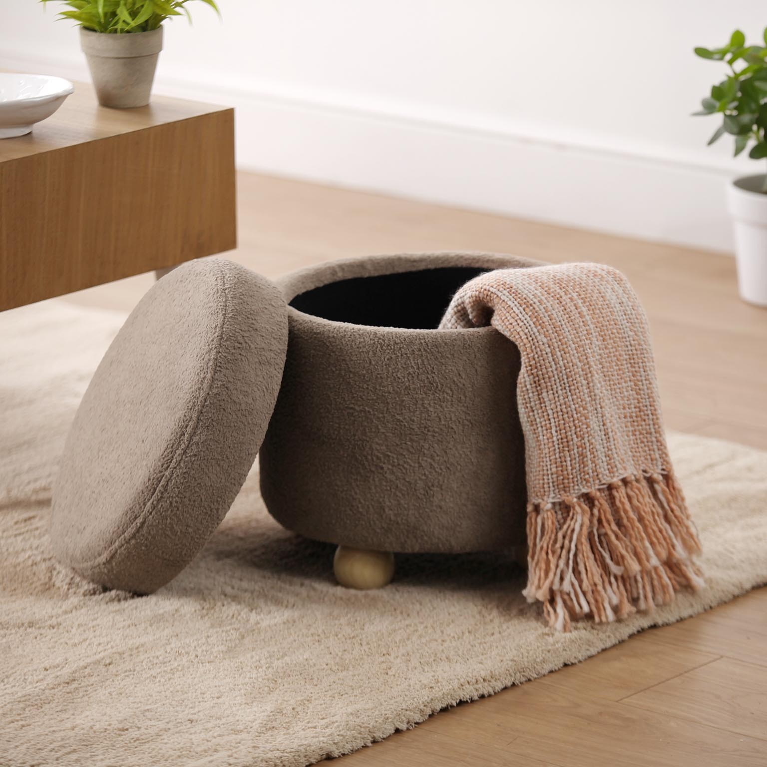 El taburete Poli con almacenaje en beige es un mueble auxiliar versátil y funcional, ideal para espacios del hogar como salones, recibidores o dormitorios.