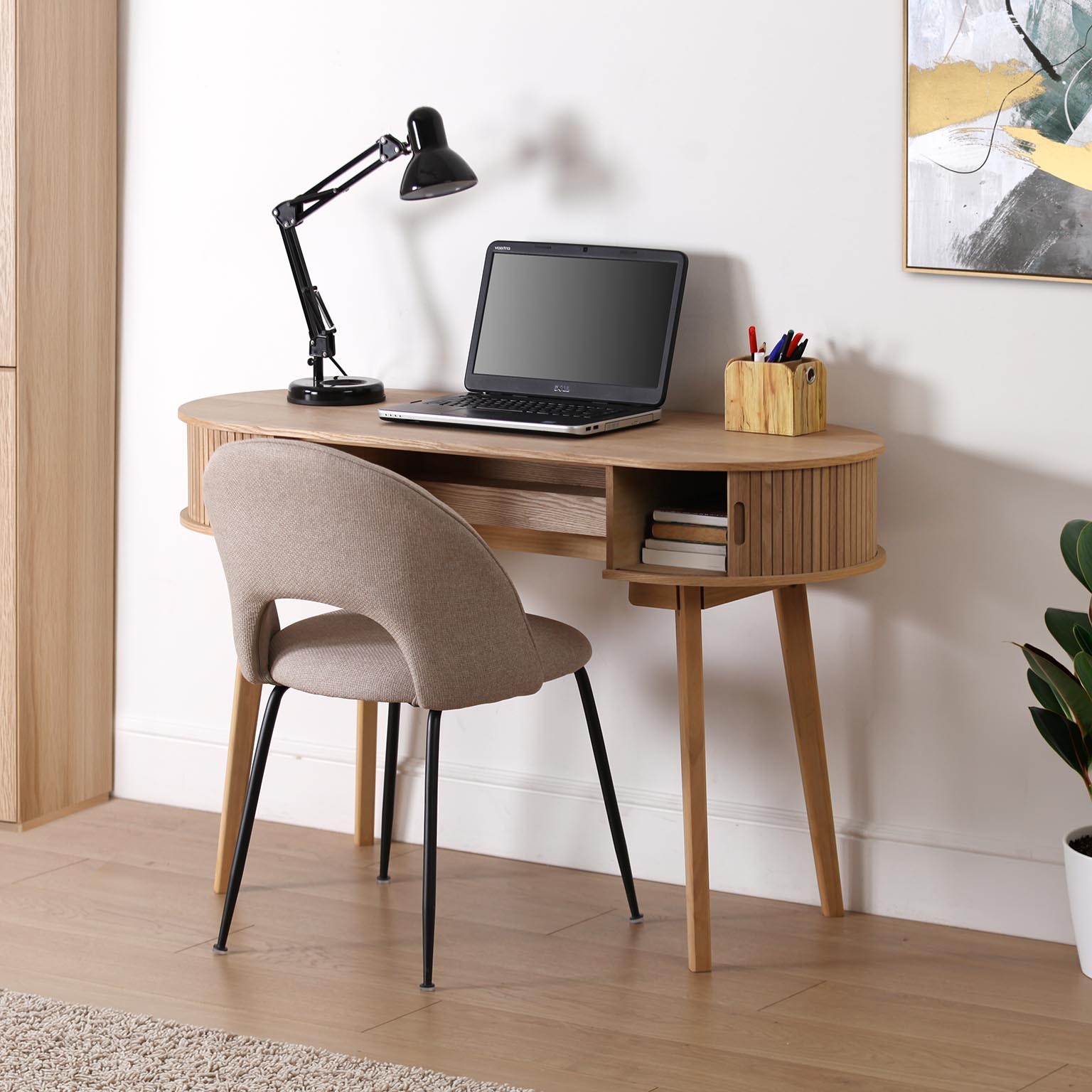 Fabricada en madera MDF y pino, su acabado en tonos claros resalta la textura natural de la madera.