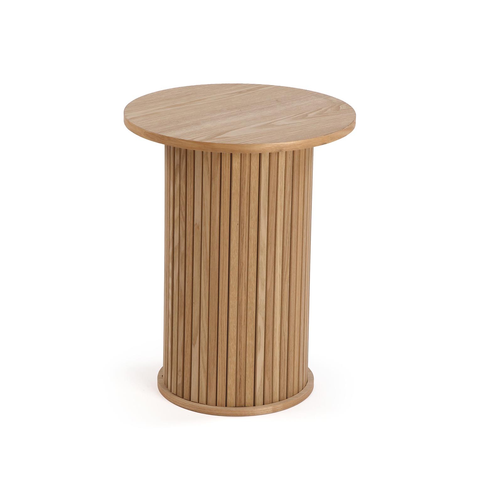 Fabricada en madera MDF y pino, presenta un acabado en tonos naturales beige claro con vetas que aportan un toque rústico y minimalista.