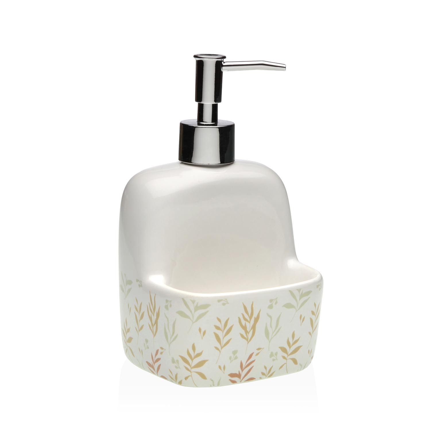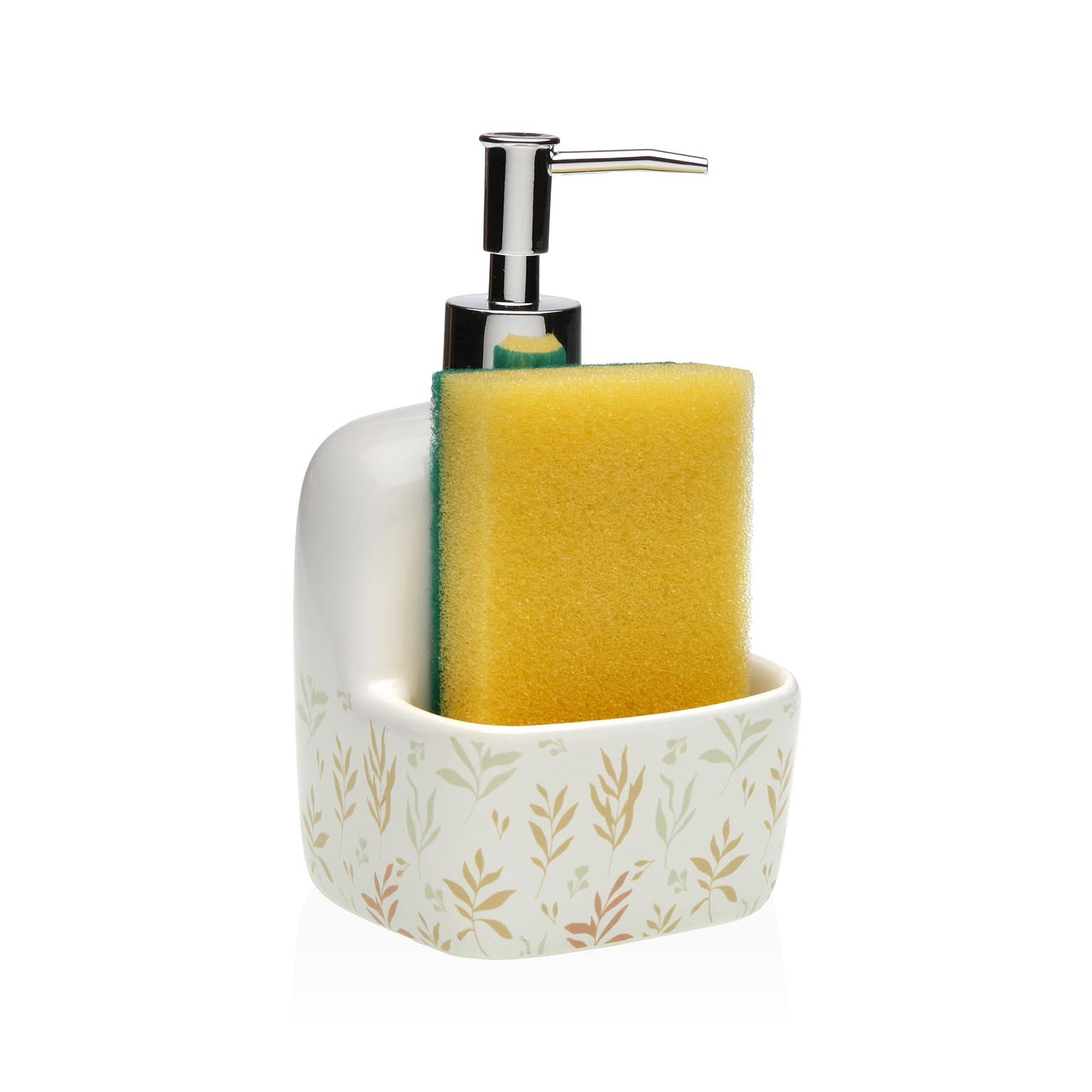 Este dispensador es ideal para almacenar jabones o detergentes, y cuenta con un soporte para esponjas, facilitando su uso en fregaderos y áreas de limpieza.