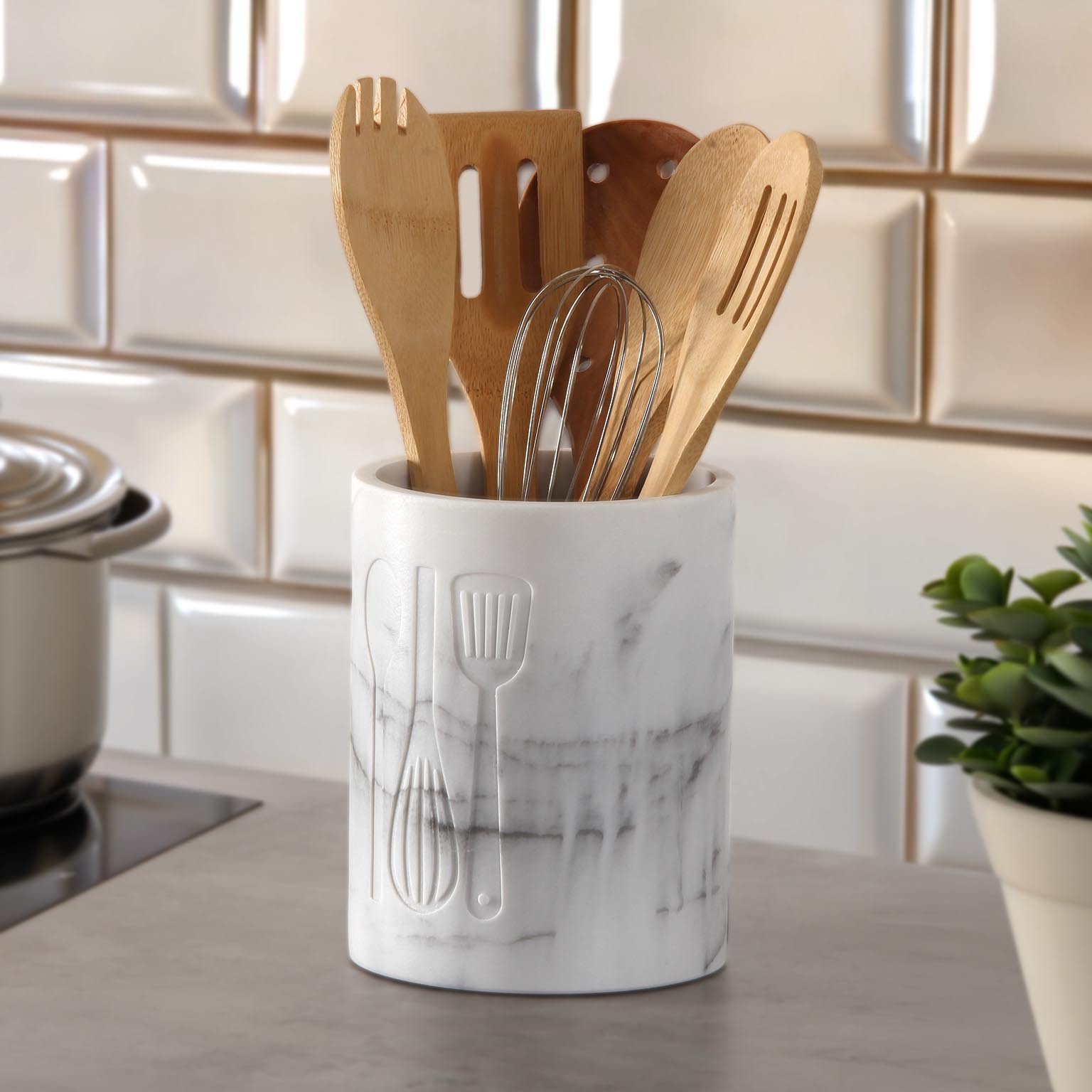 El portautensilios Viti en mármol blanco grande es un elemento funcional y decorativo para la cocina.