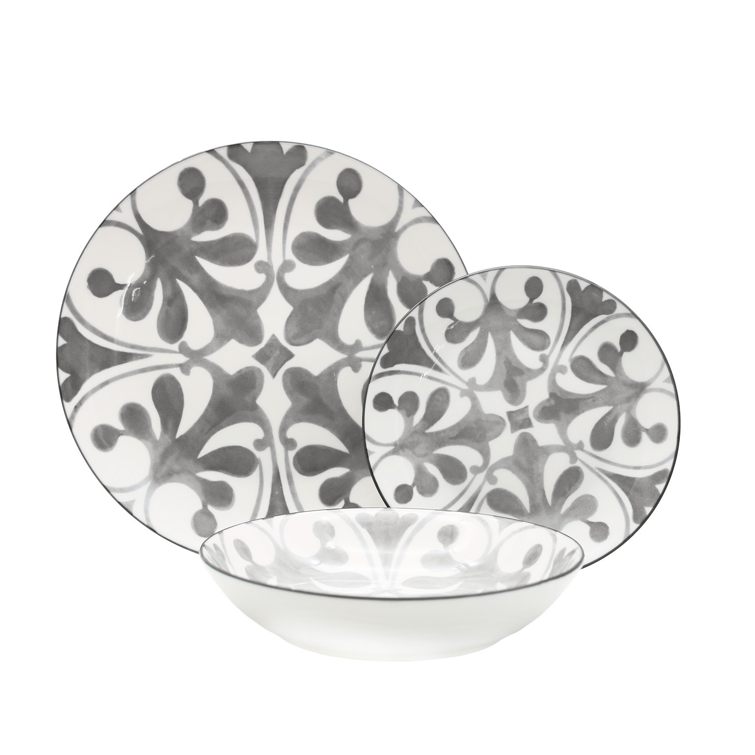 La vajilla Laila gris, compuesta por 18 piezas de porcelana, es una opción versátil para el servicio de mesa.