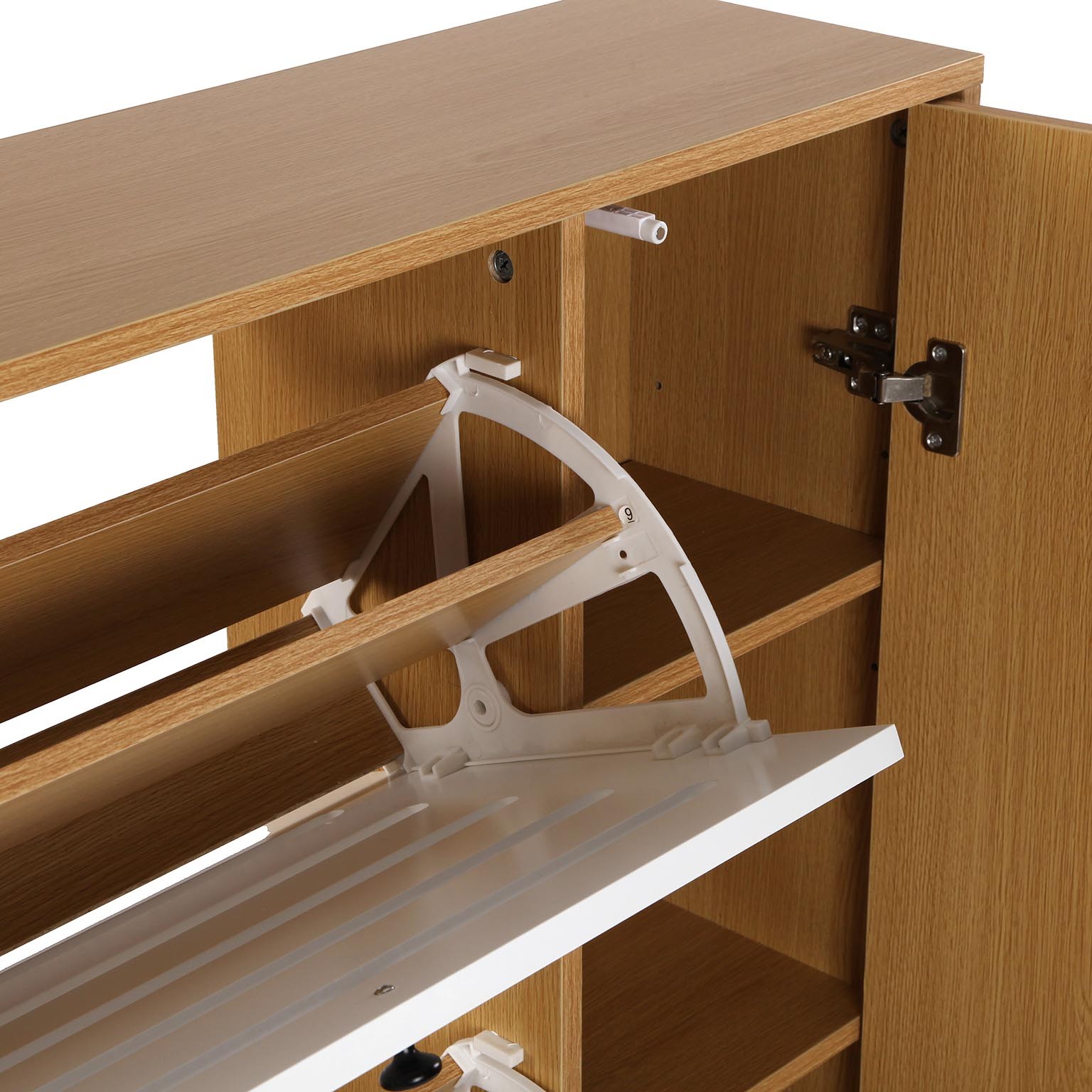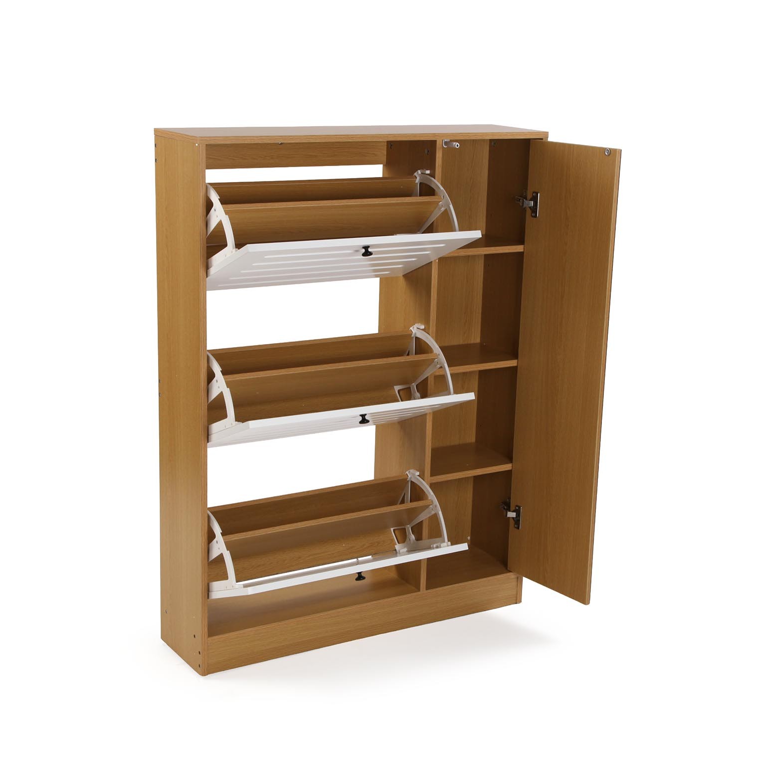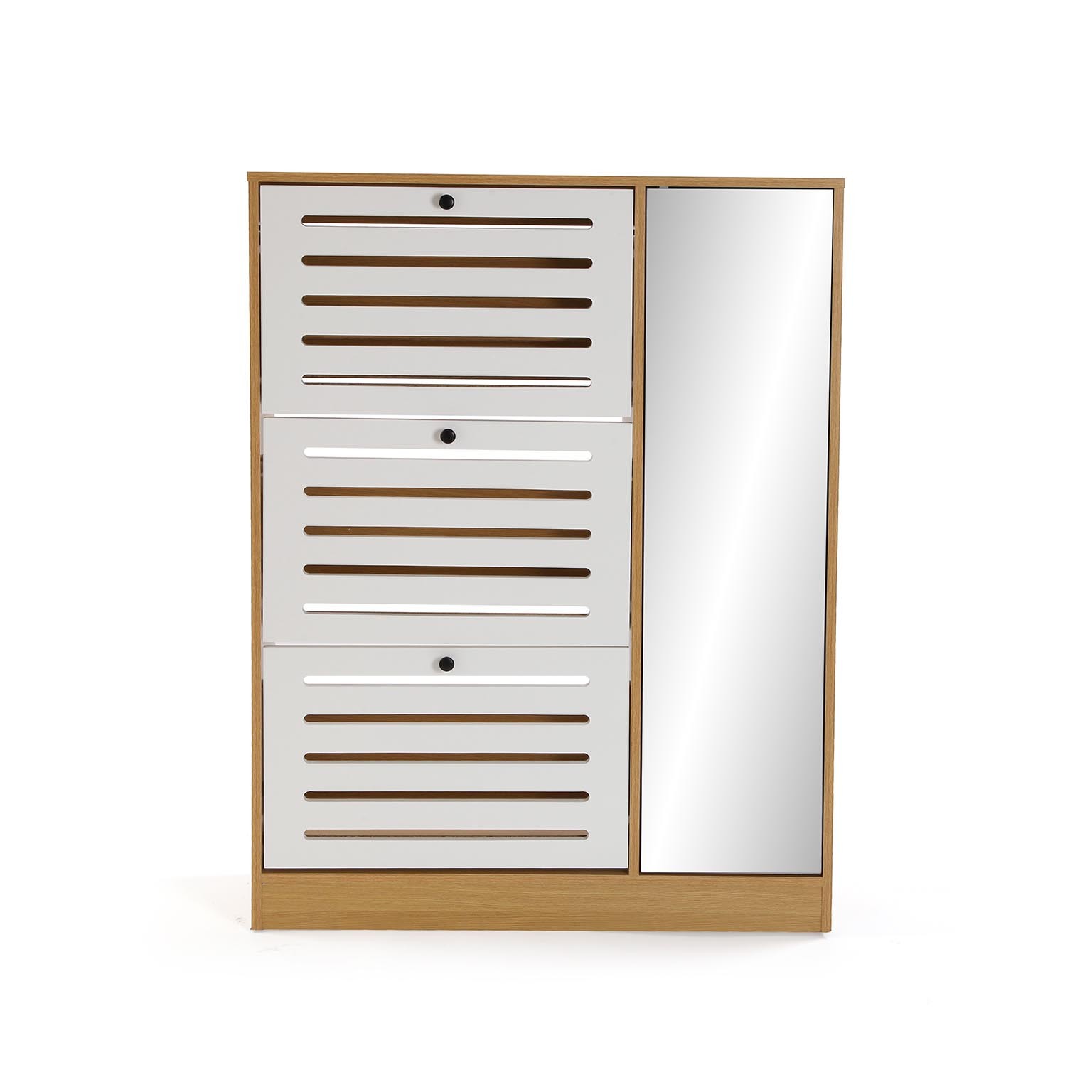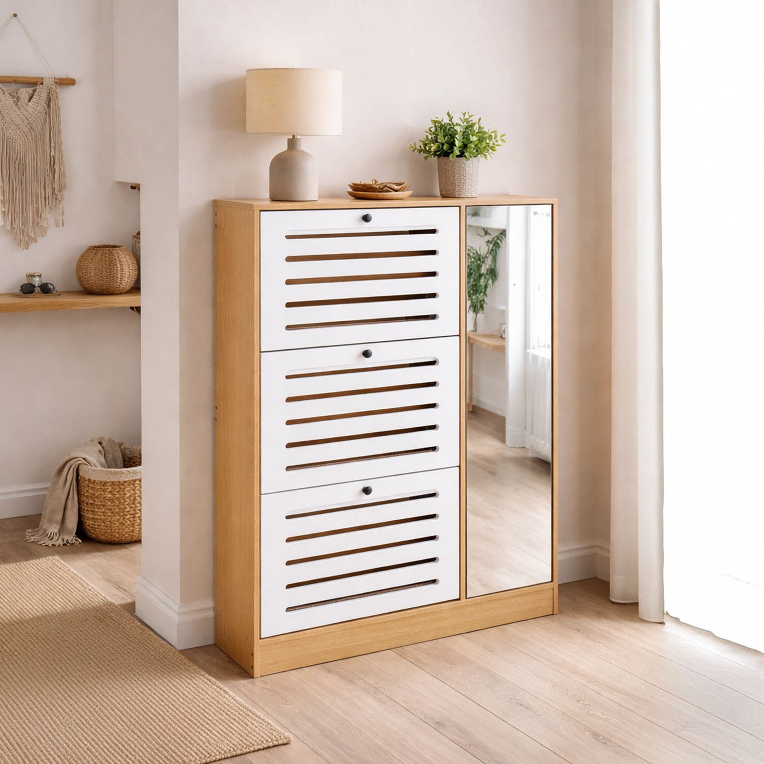 El zapatero de 3 puertas con armario de espejo es un mueble auxiliar funcional y moderno, ideal para optimizar el almacenamiento de calzado en entradas, recibidores o dormitorios.