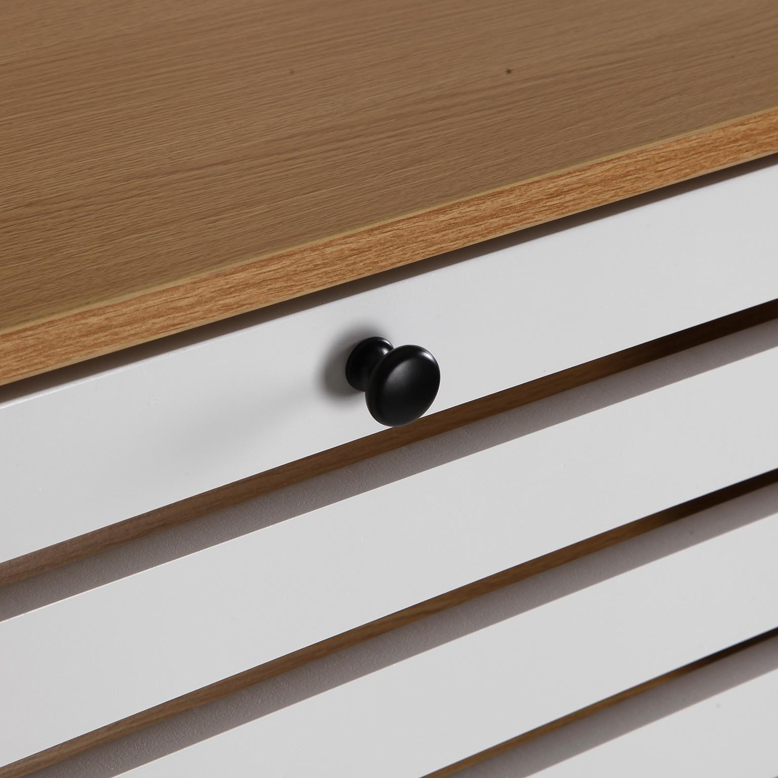 Con una estructura de madera MDF y melamina, presenta un acabado en tonos claros que se adapta a diversos estilos decorativos.