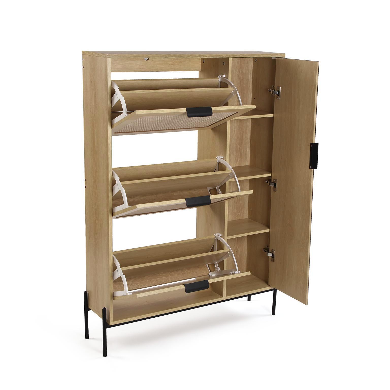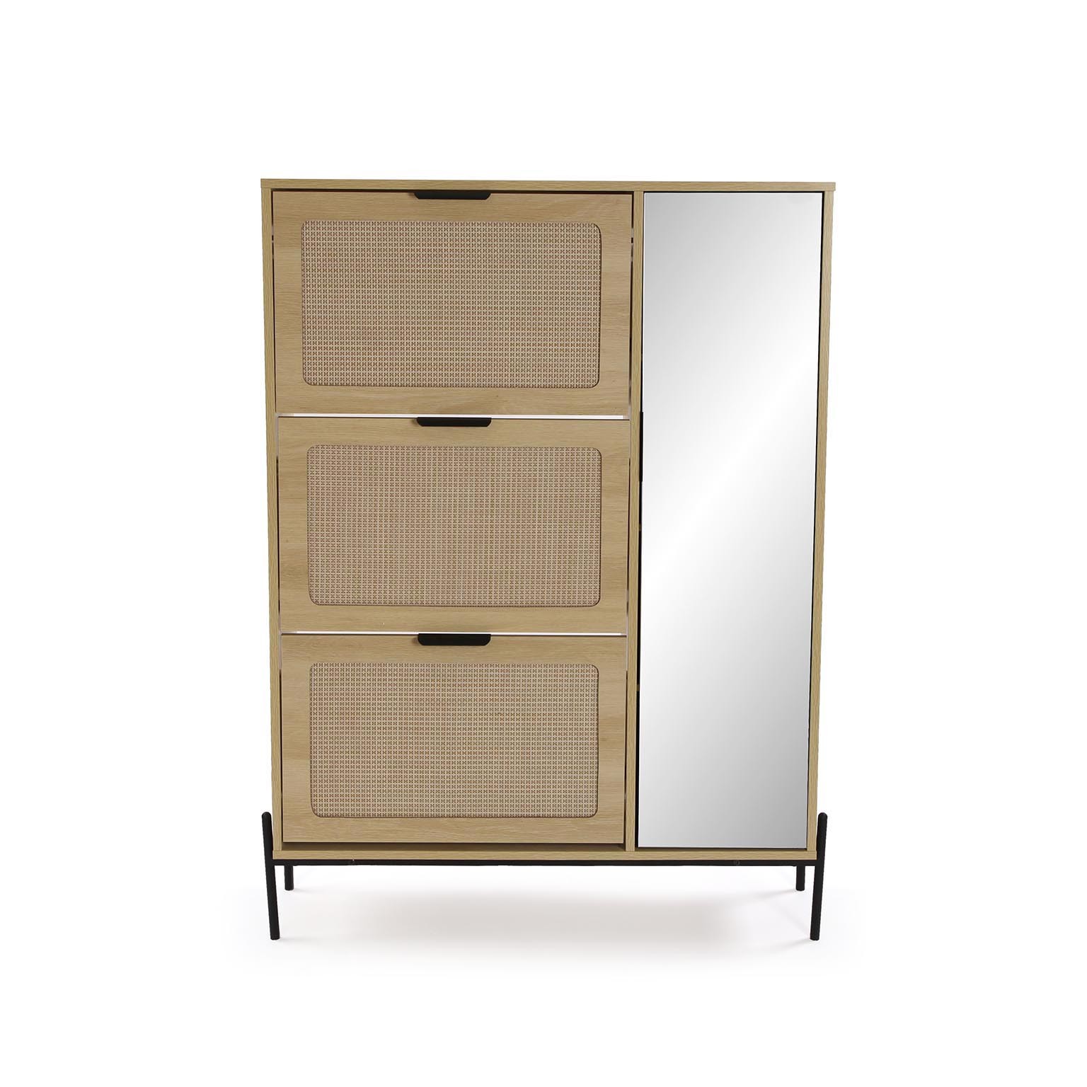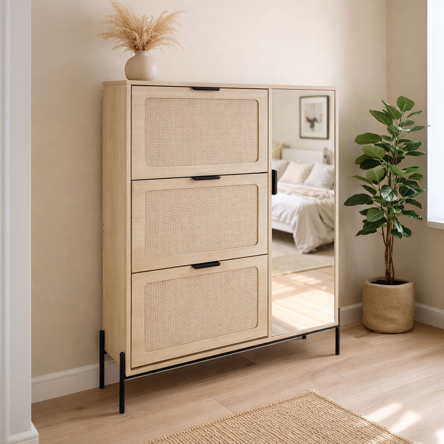 Este zapatero no solo organiza el calzado, sino que también ofrece una funcionalidad adicional como espejo, convirtiéndose en un elemento versátil para el hogar.