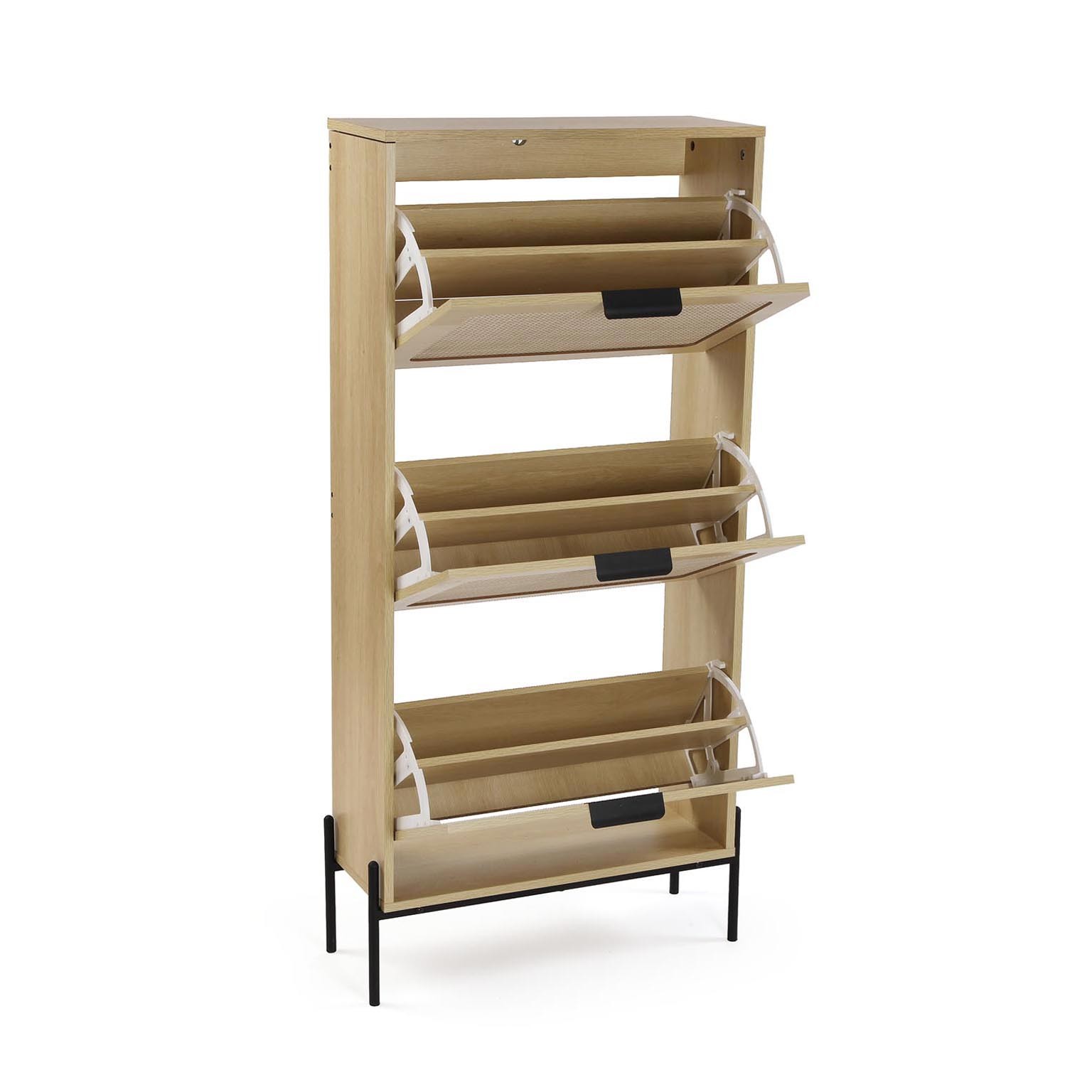 El zapatero de 3 puertas es un mueble auxiliar diseñado para optimizar el almacenamiento de calzado en espacios reducidos.
