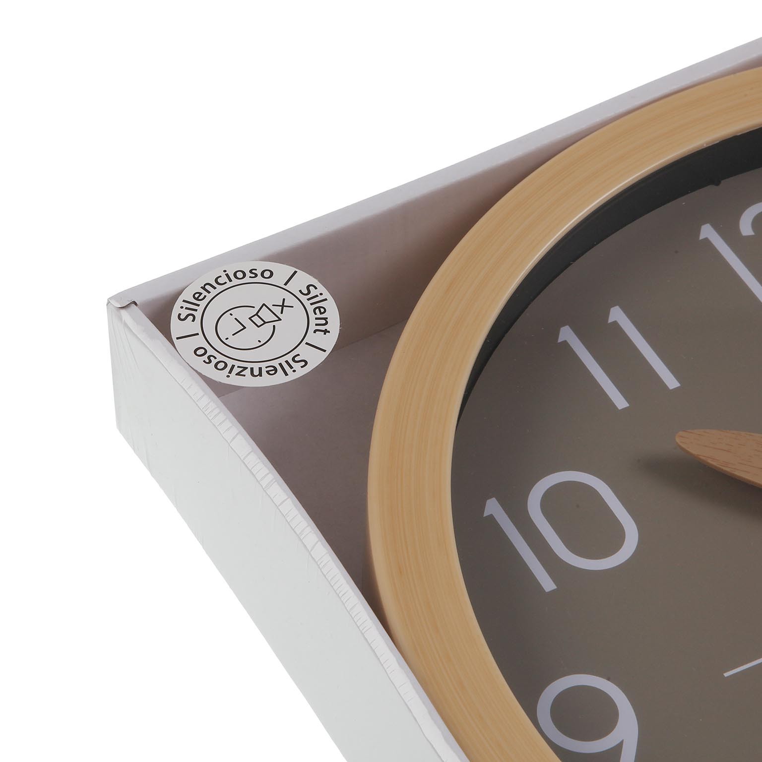 Fabricado en plástico, su diseño moderno presenta un fondo gris con manecillas de madera clara, aportando un toque contemporáneo.