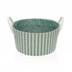 CESTA REDONDA RAYAS VERDE Referencia: 22950026 Medidas: 30x30x15 cm. Material: Algodón Poliester PVC Packaging: Info: 0.208333 kg. Asas de PVC 80% poliéster 20% algodón